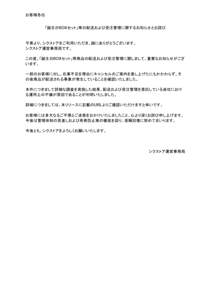 - 【「誕生日BOXセット」等の配送および受注管理に関するお知らせとお詫び】