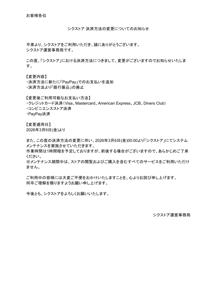【シクストア 決済方法の変更についてのお知らせ】